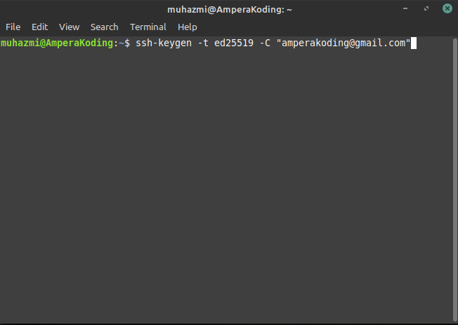 3.Masukkan kata sandi yang mudah untuk diingat, kalaupun tidak mau memasukkan kata sandi maka bisa langsung tekan tombol ENTER di keyboard. Anda dapat mengamankan kunci SSH dan mengkonfigurasi authentication agent sehingga Anda tidak perlu memasukkan kembali kata sandi Anda setiap kali Anda menggunakan kunci SSH Anda.